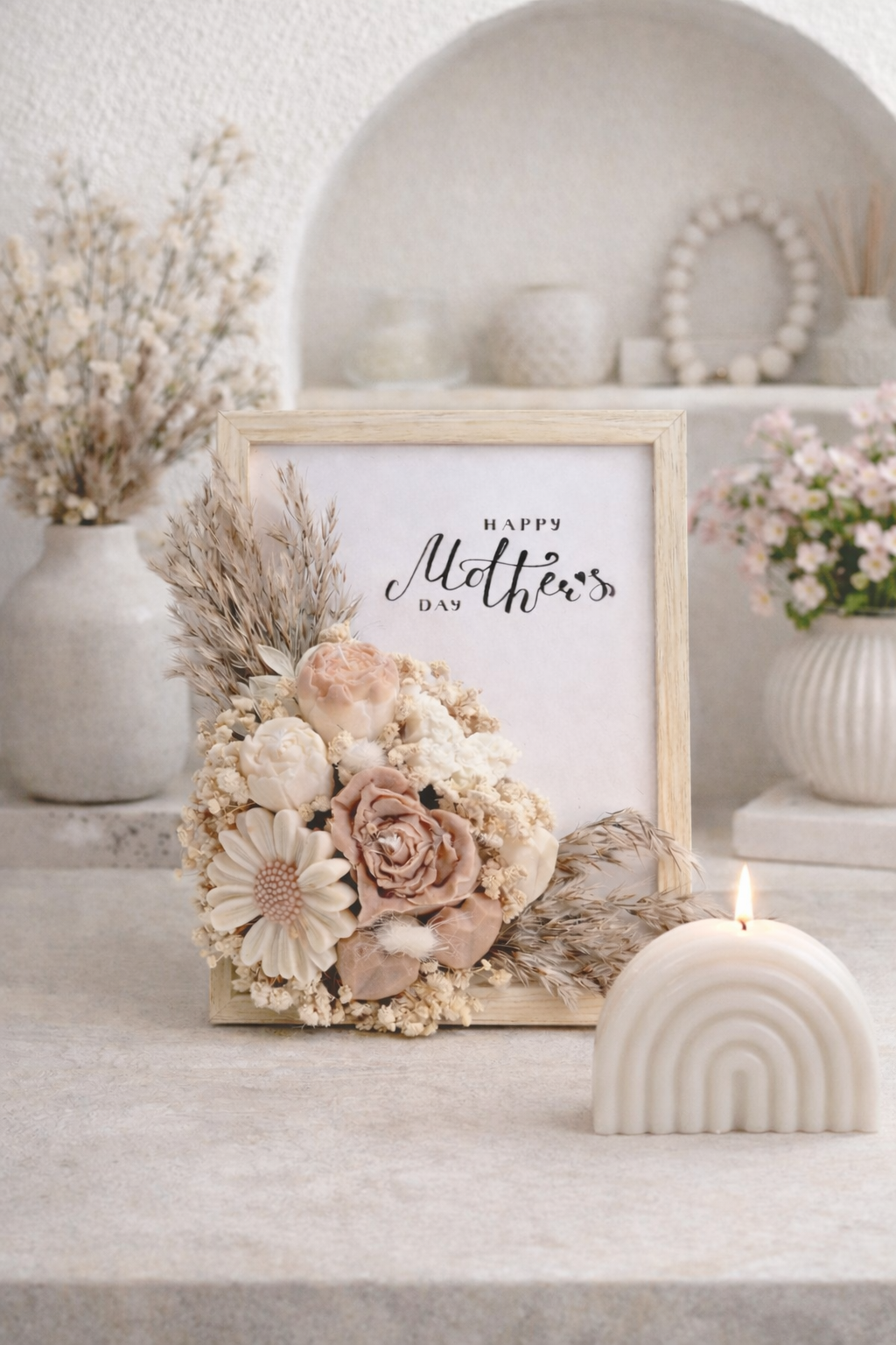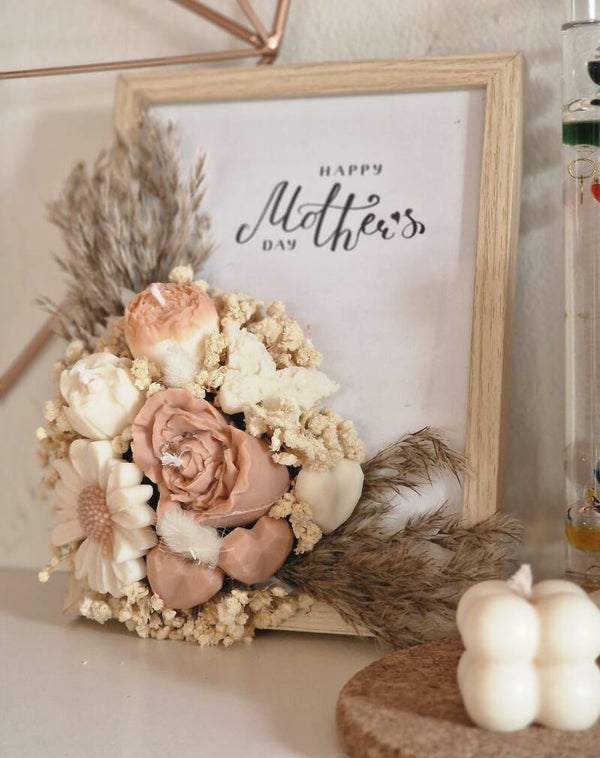 Un cadre fleuri accompagné de bougies et de fondants parfumés.